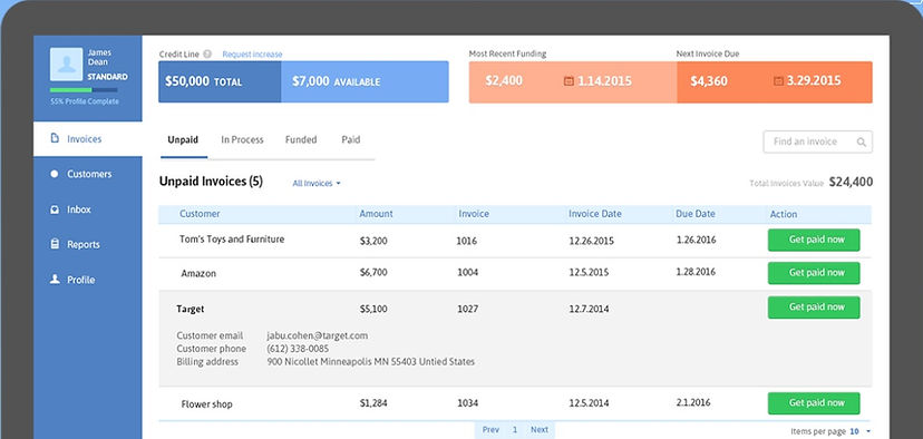You decide which invoices from what customers to submit, and only pay for what you use, so you have complete control over your funding needs.